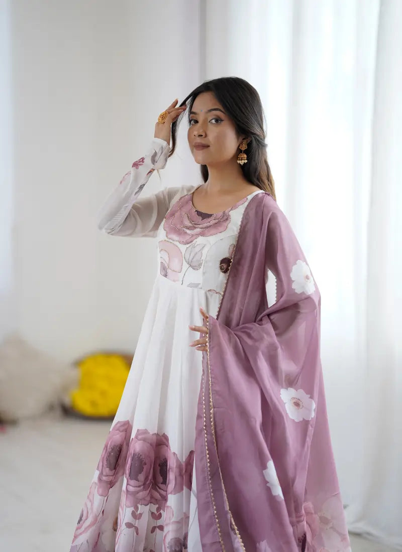 Heavy Pure Soft Organja Silk Print Anarkali Onion Pink