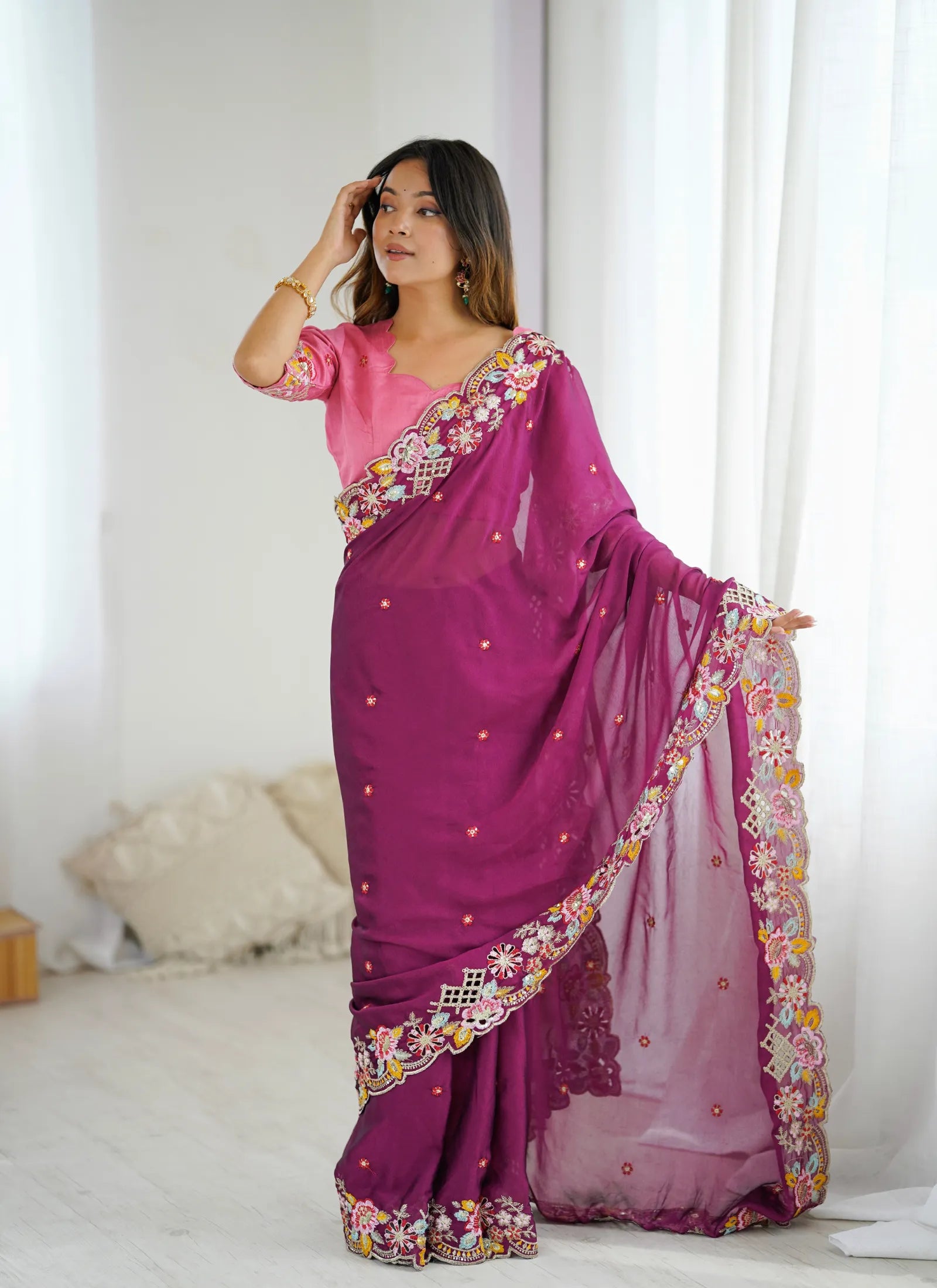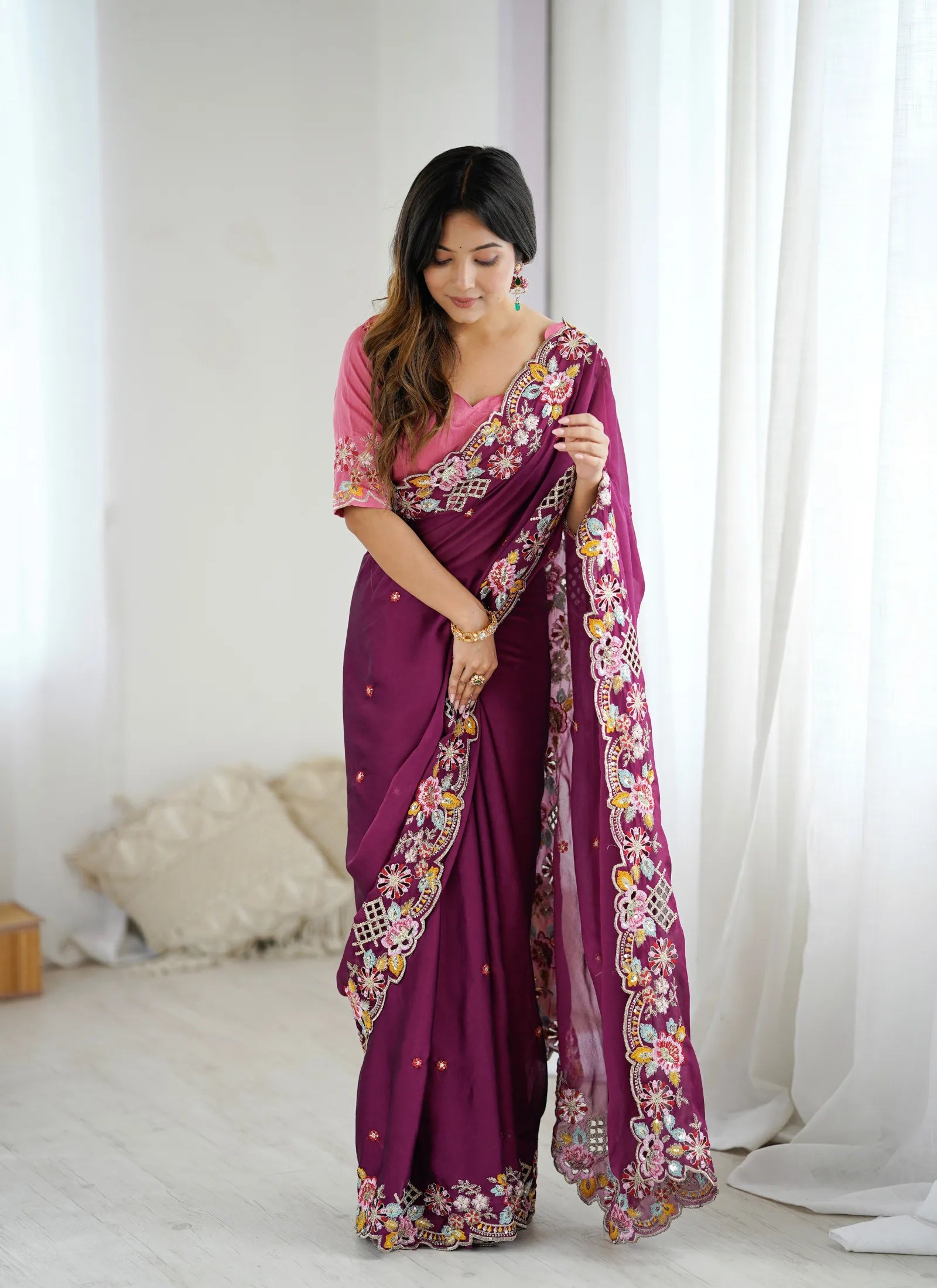 Sari Fabric: Premium Noha Crush With Heavy Embroidery Threads , Sequins Work & Fancy hand Cutwork In Work