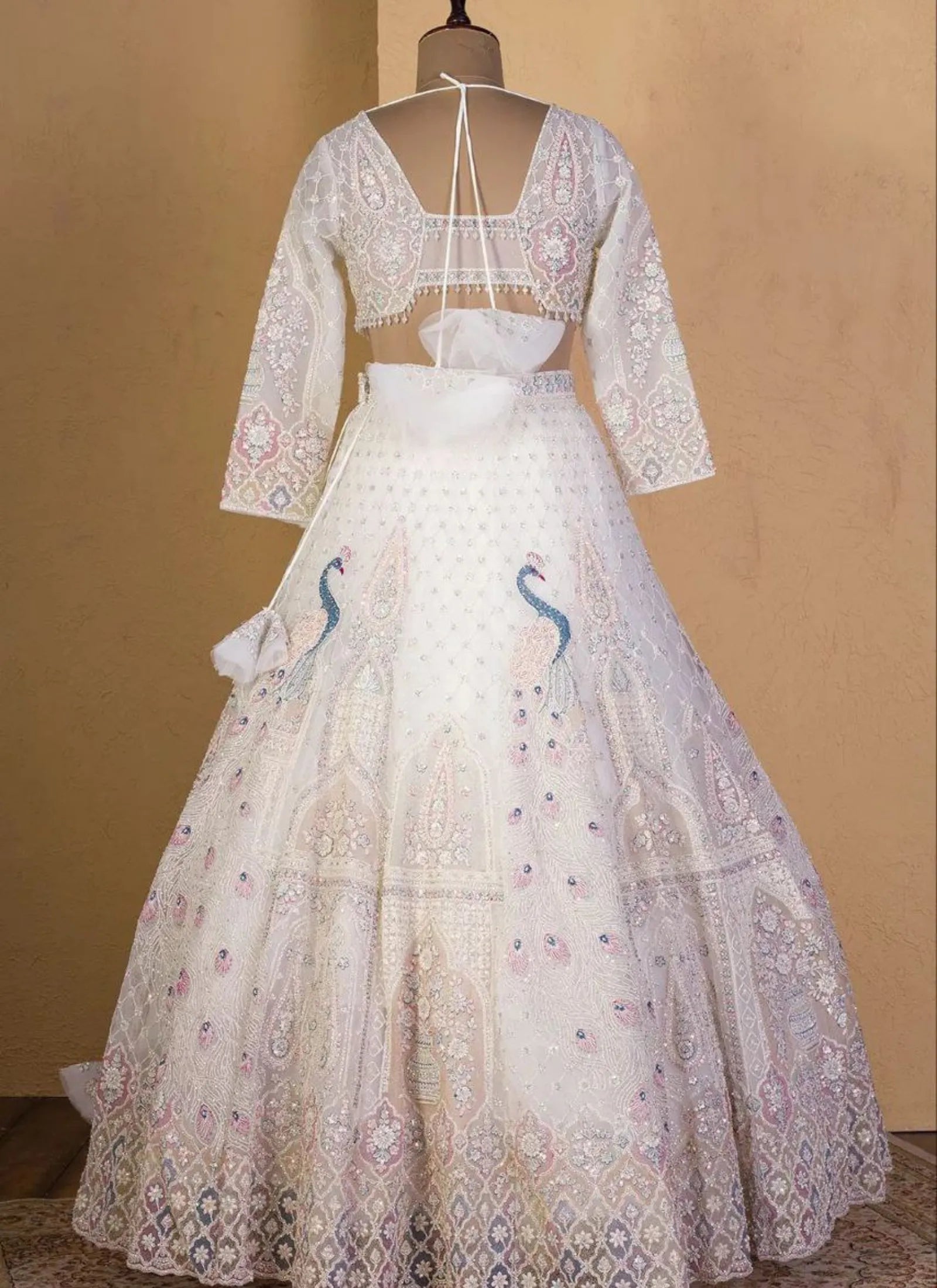 Lehenga: Premium Soft Butterfly Net Lehenga Embellished With Beautiful Multi Thread Embroidery, And Dual Coding Work And Heavy Sequins Work All Over Lehenga With Peacock Design With Heavy Cancan And Canvas With Double Inner Covering With Flair 3.5 MTR( Semi Stitched Upto Xxl )